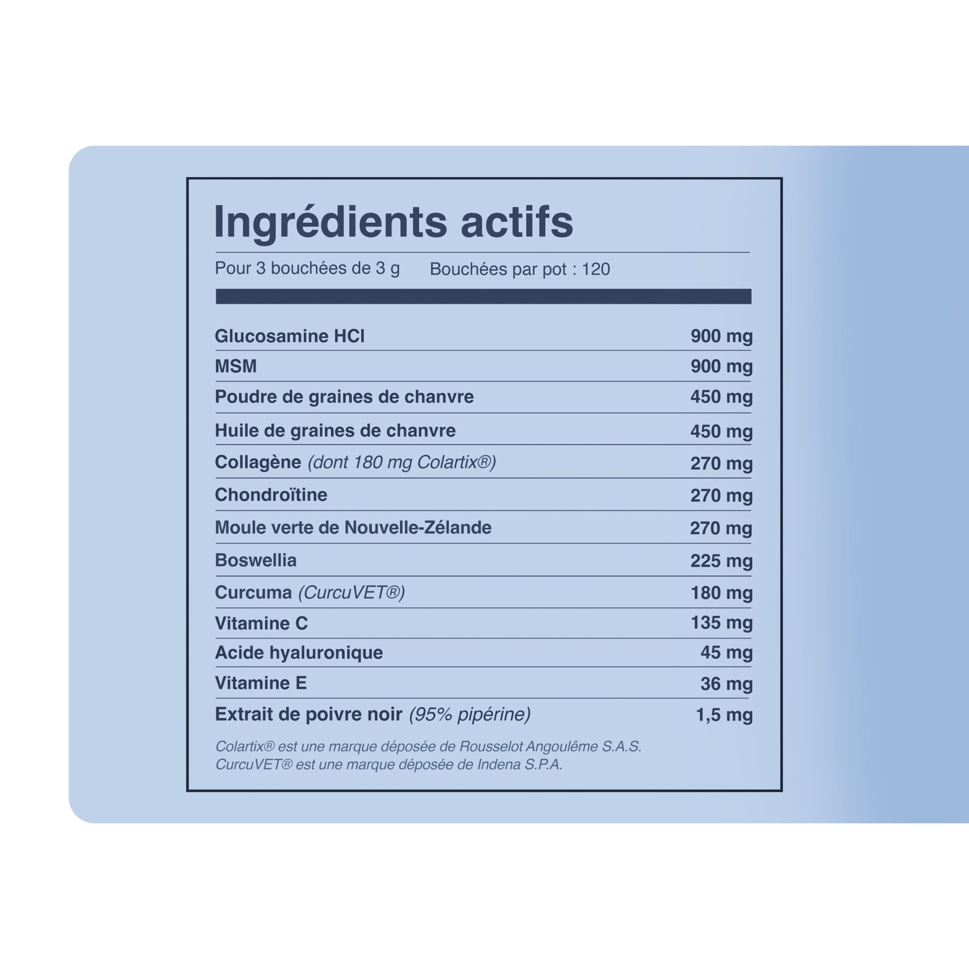Chaque ingrédient est sélectionné pour son rôle précis dans le soutien articulaire, avec des dosages adaptés à la physiologie canine.